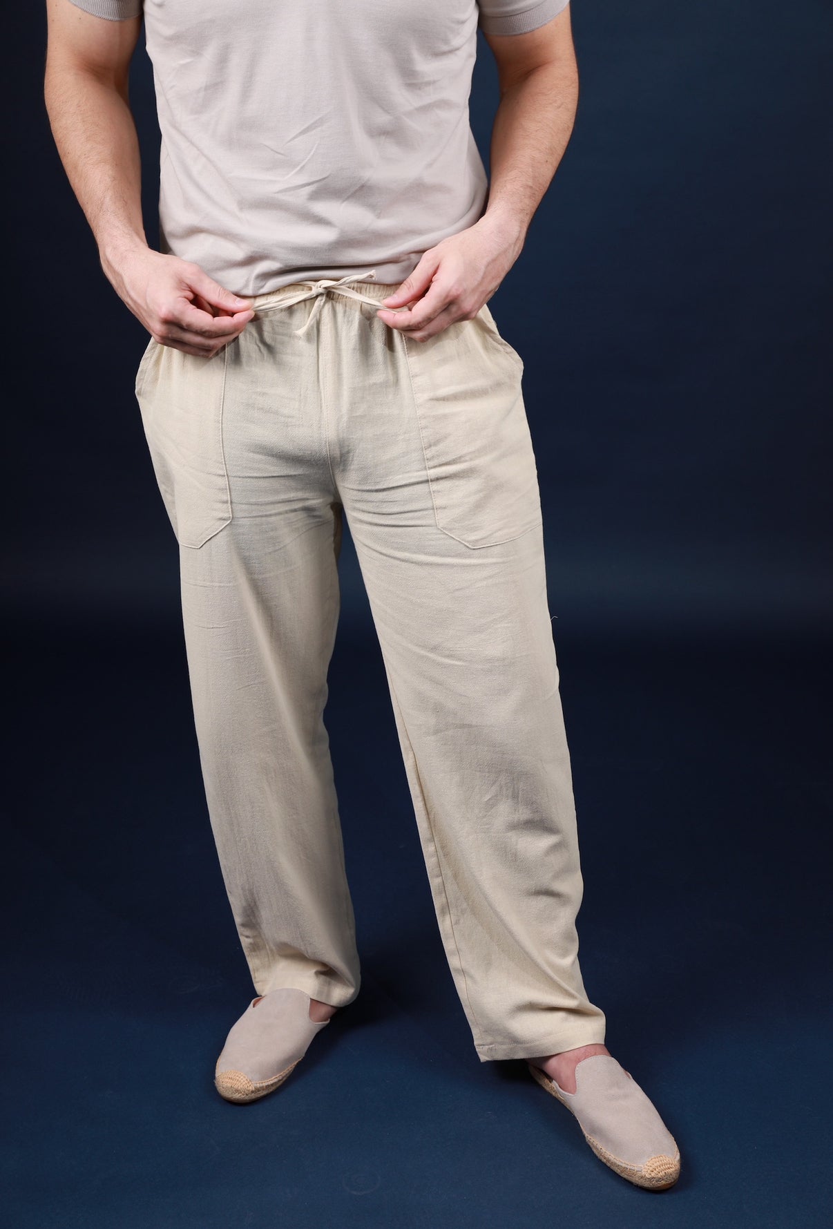 Crafted from pure linen, these relaxed-fit trousers are designed for effortless sophistication. Lightweight and breathable, they feature an elastic waistband with a drawstring for comfort and versatility. Ideal for coastal getaways or warm city days, these trousers embody understated elegance in motion.